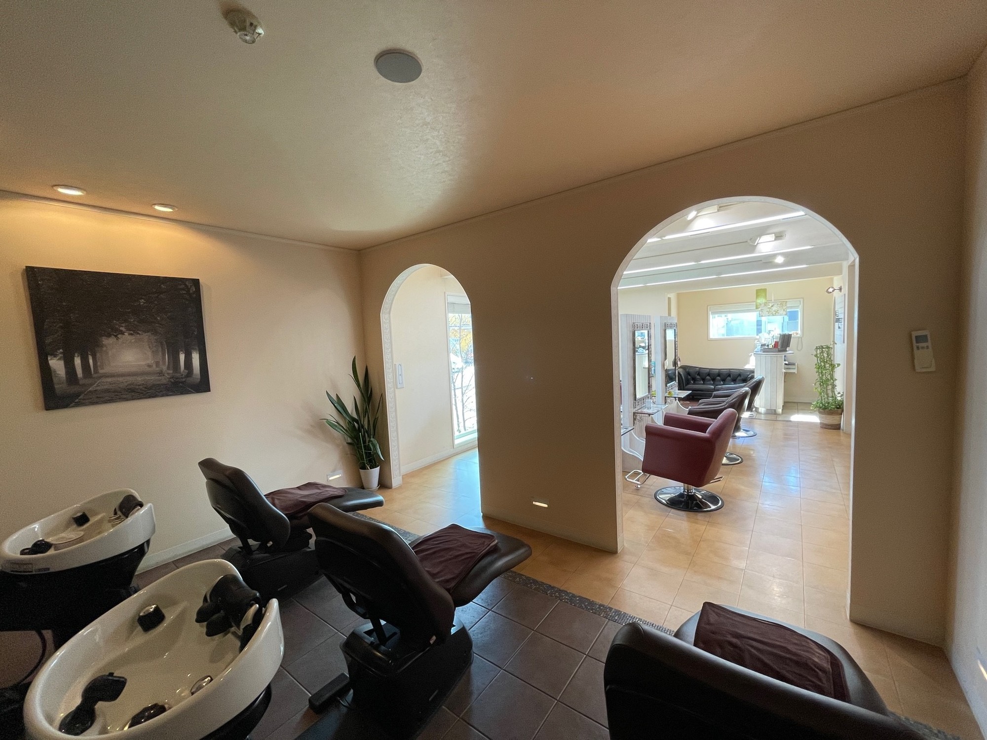少し明るさを抑えたシャンプーブースで施されるリラクゼーション、フラットな